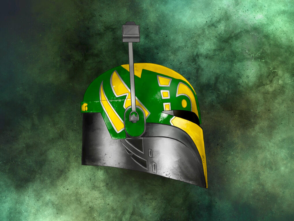 Based on Sabine’s helmet but with different colours. Green and Yellow are the colours of my Irish family crest – so, like the Mandalorians, there is an emphasis on tradition and family.