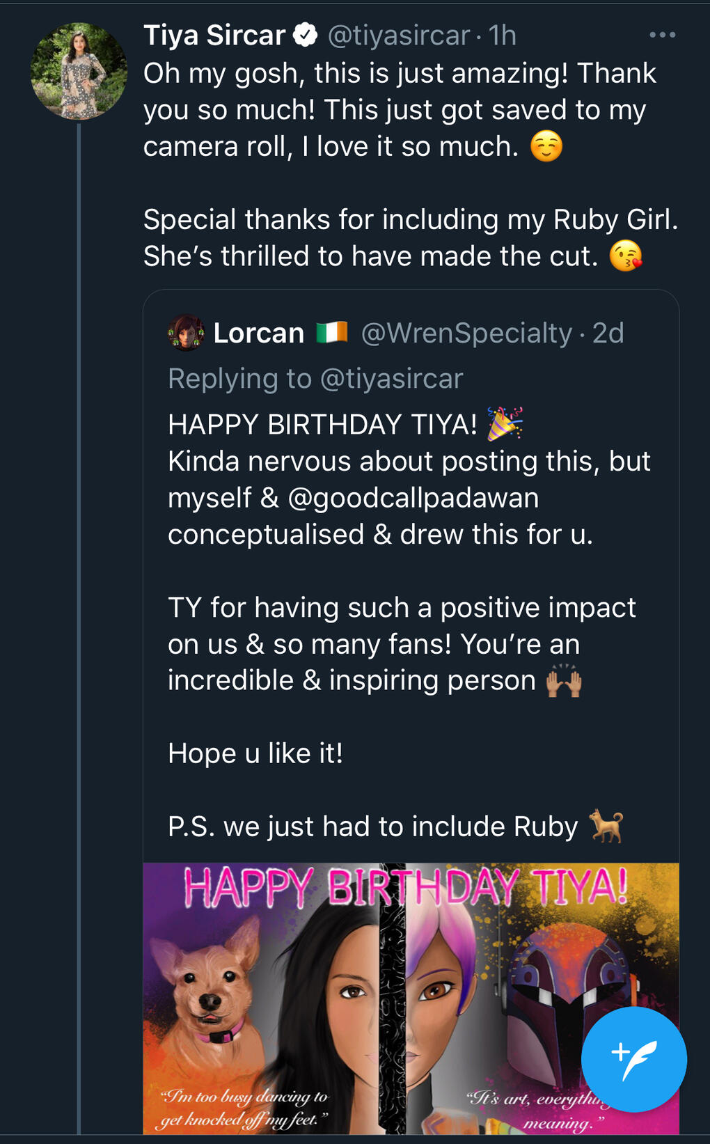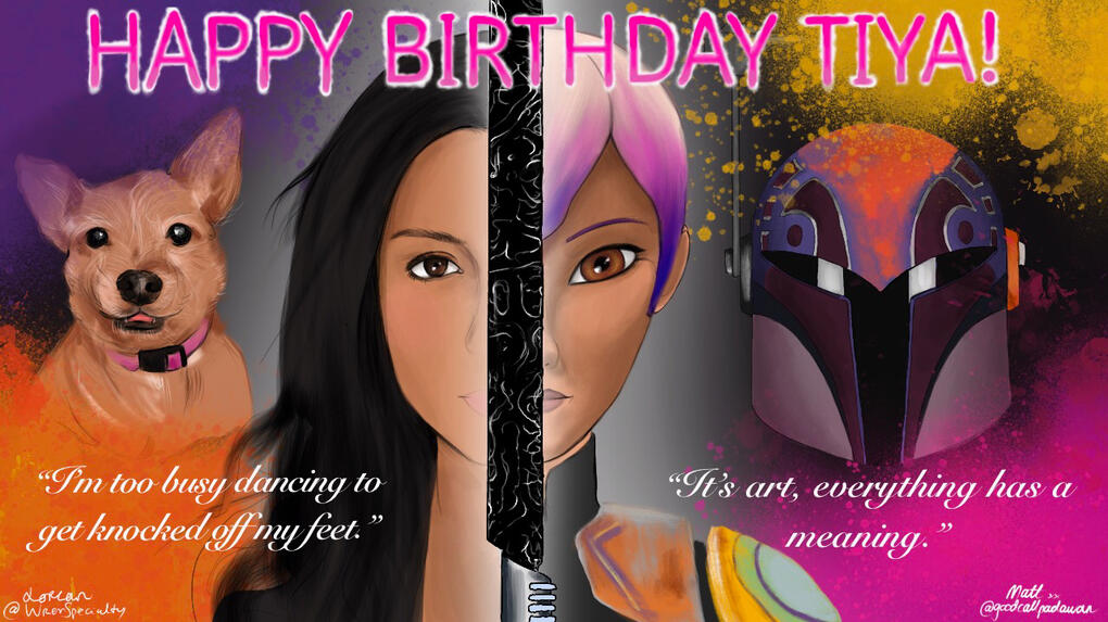 - Tiya Sircar’s Birthday Artwork 15/05/2021.She didn’t see it on her birthday (16/05/2021) until 18/05/2021_This took 3 months to conceptualise and draw. I wanted to thank Tiya for the positive impact she had on me. The darksaber splits the frame in two: the left side depicts Tiya and her dog, Ruby, with the quote “I’m too busy dancing to get knocked off my feet”; the right side shows S3 Sabine and her helmet with the quote “It’s art, everything has a meaning.”It was a success! Tiya saw it (thanks to my moots who shared the artwork and got Tiya’s attention <3) and saved it to her camera roll.